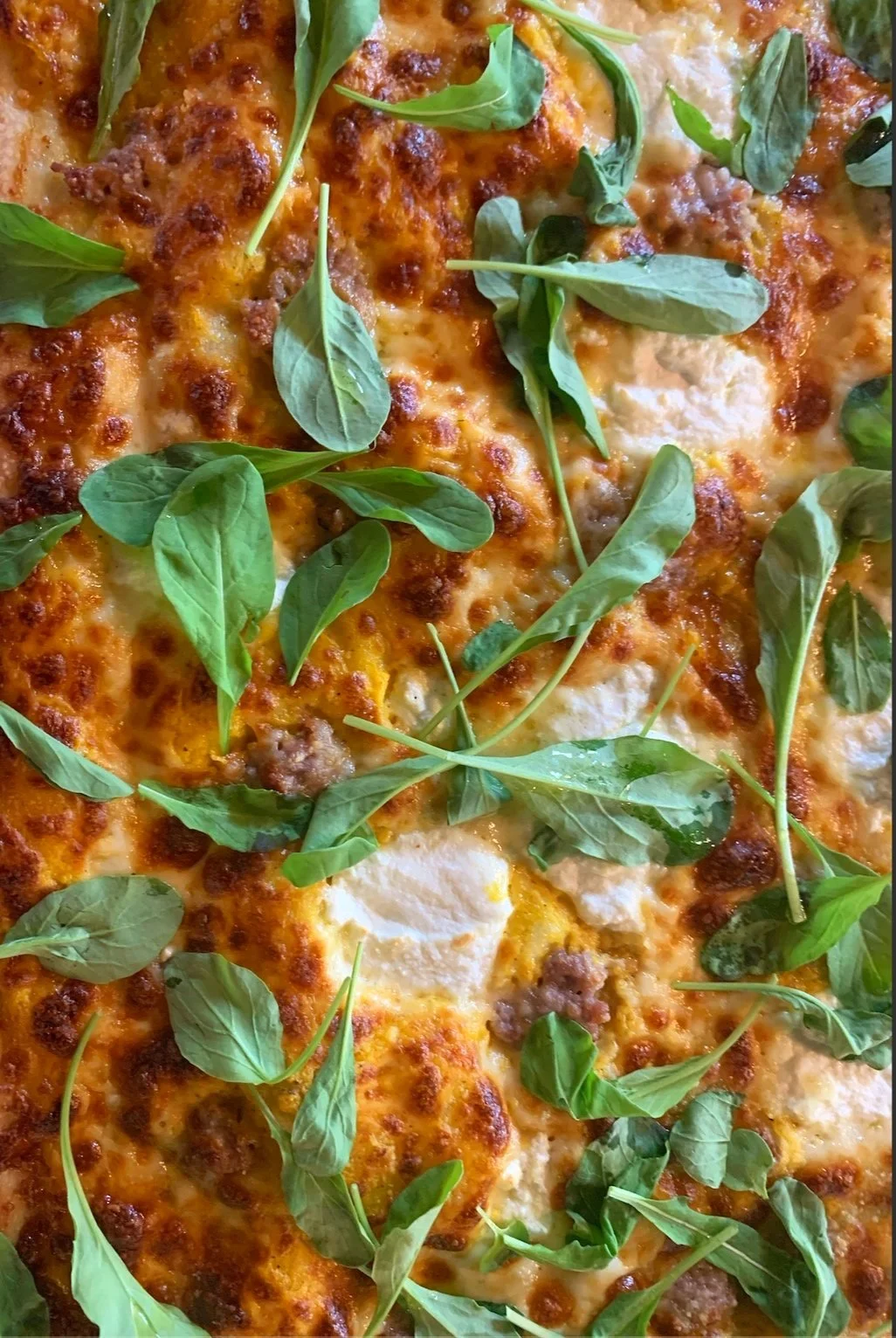 pork sausage, spinach, ricotta, mozzarella, organic tomato sauce, oregano, parmesan